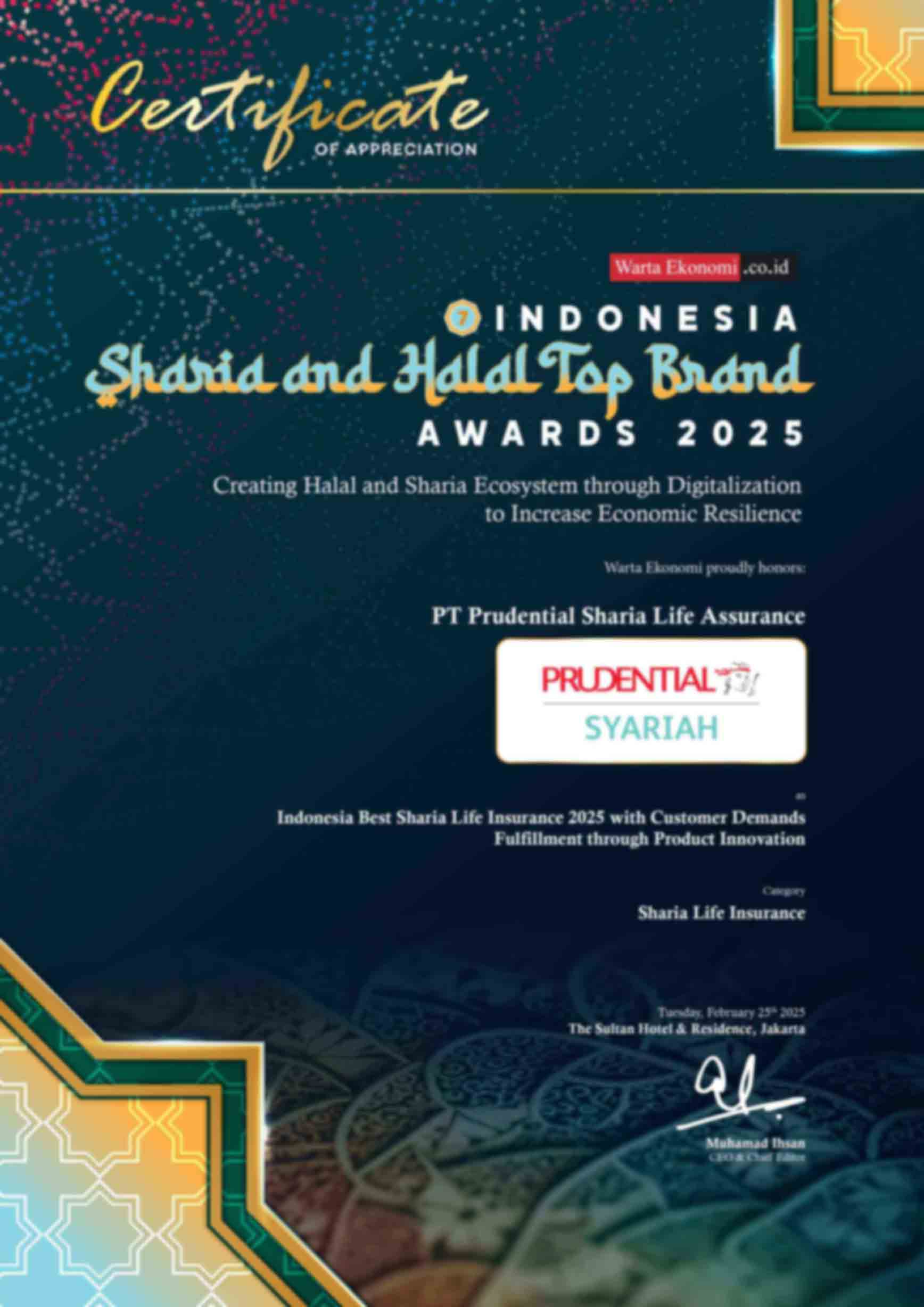 Atas kepercayaan yang diberikan peserta dalam mengelola solusi proteksi syariah, Prudential Syariah meraih penghargaan Indonesia Best Sharia Life Insurance 2025 with Customer Demands Fulfillment through Product Innovation pada kategori sharia life insurance di ajang Indonesia Sharia and Halal Top Brand Awards 2025. Penghargaan yang diberikan oleh WartaEkonomi.co.id merupakan bentuk apresiasi atas inovasi produk serta komitmen Prudential Syariah dalam memenuhi kebutuhan peserta.