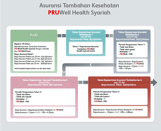 Dalam hal Polis memenuhi seluruh syarat-syarat yang ditentukan dalam beberapa Periode Pengamatan secara berturut-turut maka besar PRUWell pada suatu Tahun Kepesertaan Pada Asuransi Tambahan PRUWell Health Syariah berjalan, sebagai berikut: